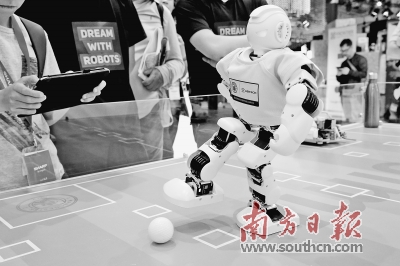 优必选生产的Alpha Ebot身着曼城球服帅气亮相,受到参展客商的关注。 南方日报记者 鲁力 摄 |
