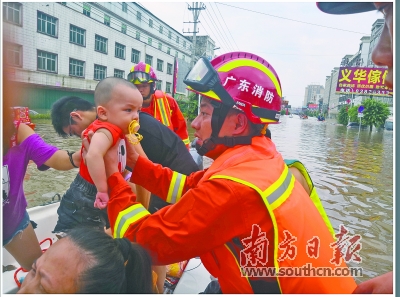 9月2日,汕头潮阳区,救援人员在转移一名幼儿。通讯员供图 |
