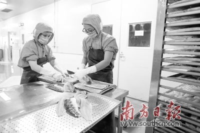 中山市渔歌子食品有限公司车间内,工作人员在加工生鱼。 南方日报记者 叶志文 摄 |