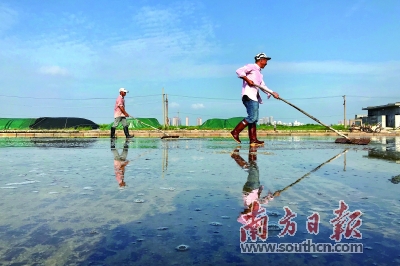 “这些海水来自南海,每天都有一个海水盐度最高的时刻,我们就把海水引进来以后,逐个池子过滤,最后在结晶池里结晶,一般海水盐度为24度的时候才可晒盐,就会成型。如果天气好的时候一般下午5点多放水,第二天早上8点就可以扒盐了。” 青洲盐场负责人洪远生说,“扒盐所用的工具皆是桃木所制,虽然笨重,但是不会吸收太多的盐分,爬越多次,盐就越细。一个池子需要10多个人同时去扒盐。”