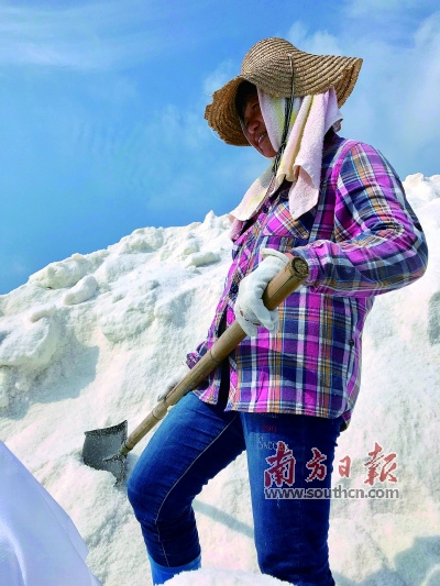 记者也发现,现场的工人年龄都平均在40多岁,有一位阿姐还是退休后还主动回来干活。“因为工作比较艰苦,很多年轻人都已经不愿意来盐场工作。”阿姐告诉记者。