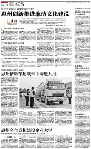 惠东县拍摄制作了“勤耕重读,修身洁行—惠东县皇思扬家风印象”专题片,教育党员干部把家风建设摆在重要位置,自觉廉洁修身、廉洁齐家;大亚湾区组织廉政小品大赛,挖掘出《悲剧不能重演》《特殊来者》等优秀作品,以优秀的文艺精品为载体,大力弘扬廉洁文化;惠城区举办全区廉洁知识竞赛,同时邀请专业人士作曲作词,创作廉洁歌曲《为了你的荣耀》。