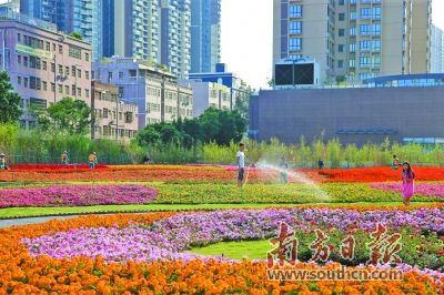 深圳街头,环卫人员在给花坛浇水。 |