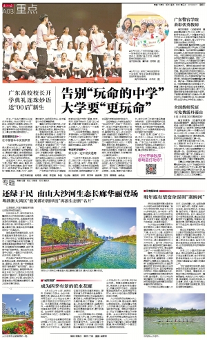 9月8日上午11时,在深圳市、区领导以及院士、企业代表、居民代表、建设企业员工代表的共同见证下,大沙河生态长廊2公里示范段正式对市民试行开放。河水碧波荡漾,两岸繁花盛开,一条美丽的生态长廊连通深圳湾滨海休闲带,让市民流连忘返。生态城市、绿色家园,这是南山城市竞争力的又一张有影响力的名片。