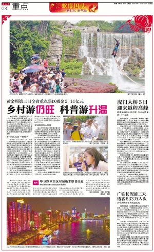 南方日报讯 (记者/周人果)10月3日,广东省旅游局透露,截至3日15时,全省纳入统计的109家重点景区接待游客236.7万人次,同比增长12.1%;收入2.44亿元,同比增长10.7%。乡村游、古驿道游等线路依然热度不减。值得关注的是,随着假期近半,短途自驾游客数量迅速增长,红色旅游、科普旅游、体育旅游逐渐升温,全域旅游渐入佳境。