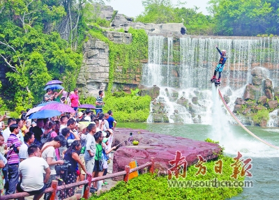 在深圳世界之窗景区,别开生面的水上摩托艇特技飞行表演吸引了大批游客观看、喝彩。南方日报记者 鲁力 摄 |