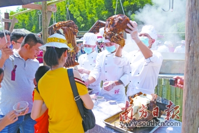 在广州从化,游客在莲麻头酒文化节上品尝3米多宽大锅古法烹饪的牛肉。南方日报记者 符超军 摄 |