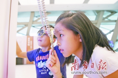 在深圳当代艺术与城市规划馆人民币发行70周年纪念展上,小朋友用放大镜观看人民币防伪油墨的种类。南方日报记者 朱洪波 摄 |