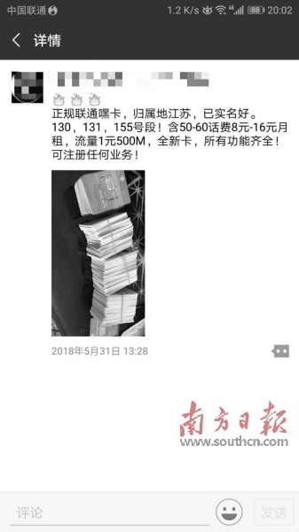 记者翻看该卖家的朋友圈发现,其内容均为贩卖各类实名电话卡的信息,“可提供江苏移动13/18号段、浙江电信13/15/18/19号段、北京移动13/18号段、江苏联通130/131/155号段的已实名注册电话卡售卖”,不过没有标注价格。