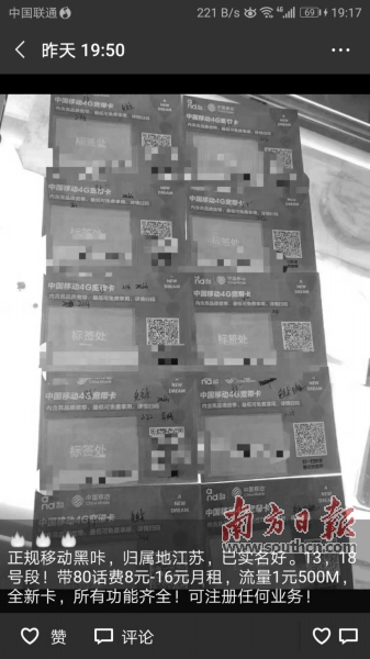 卖家在朋友圈发布的已实名电话卡信息。 |
