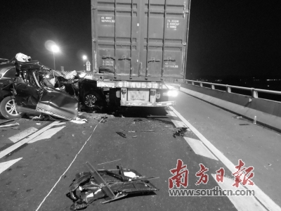 国庆前一天,卢某驾驶小轿车沿京港澳高速快车道由南往北行驶至北兴立交转大广高速匝道对出路面,在从快车道变更至慢车道时(跨越车道分隔实线),与重型半挂牵引车牵引的重型低平板半挂车发生碰撞,造成小轿车上一名乘客当场死亡、两名乘客受伤及两车、路面设施损坏的交通事故。