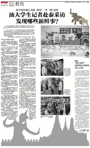 为进一步探索“一带一路”倡议带来的新机遇,加强海外潮商侨胞与家乡的联系,汕头大学长江新闻与传播学院组织选拔8名学生,组成2018年新闻学院泰国报道团,在为期10天的行程中,深入泰国探寻海外潮人的身影,用镜头定格异国风情,用文字展示“一带一路”在海外取得的成果。