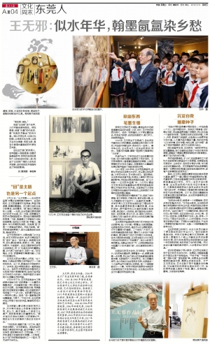 9月25日,“山水城象——王无邪作品展”开幕式在莞城美术馆举行。在活动现场,王无邪身着深灰色西装,声音沉稳浑厚,神情和善谦逊。作为首次在故乡举办的展览,在他看来,“回”是这次展览的核心主题。一方面,王无邪通过展览回顾自己的艺术生涯;另一方面,他带着自己的艺术成就回到故乡,寻找自己精神家园的根源。“之前,香港理工大学曾举办过我的回顾展,当时主办方把‘回’字融入一幅画中,作为该展览的海报。我觉得‘回’字是一个很适当的表达。而此次到莞,‘回’字的感觉就更强了,因为这里是我的出生地,是我的家乡。”