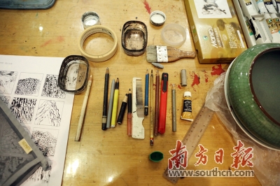 蜡笔、铅笔、水溶性彩色铅笔,甚至梳子,都是王无邪的创作工具。莞城美术馆供图 |