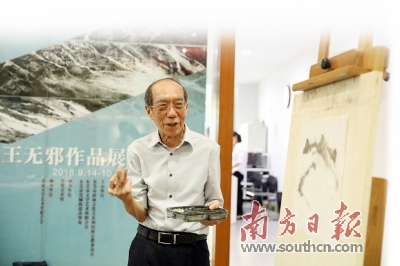 9月26日下午,王无邪受邀参与了莞城美术馆举办的“名家课堂——水墨艺术雅集活动”,与绘画爱好者一同分享自己的艺术成果。他作画时挽起衣袖,用满是皱纹的手指紧紧夹着笔,站立在画板前示范讲解了一个多小时。他的妻子就坐在一旁的听众席上,她说:“他一直都是这样站着画画,习惯了。”片刻之后,王无邪便开始分析起了自己的作品,解答现场观众提问。