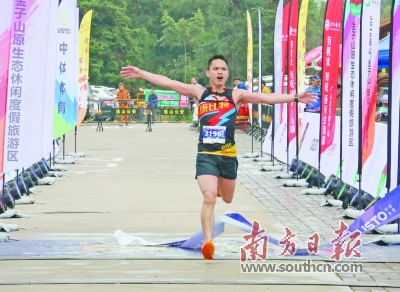 经过4小时15分27秒的鏖战后,挑战组选手奚仕席冲线到达金子山景区终点,获得男子挑战组第一名。杨溢子 摄 |