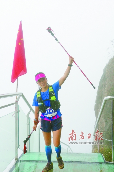 一名女选手在登上广东海拔最高的金子山玻璃栈道后,兴奋地举起手中的登山杖。杨溢子 摄 |