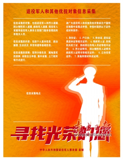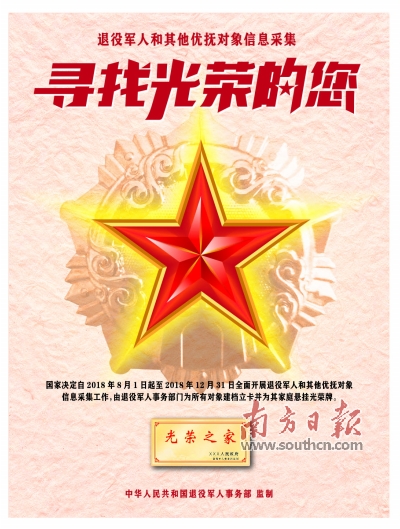 党中央、国务院历来高度重视退役军人服务管理工作。为贯彻落实党中央、国务院决策部署,使为退役军人和其他优抚对象家庭悬挂光荣牌工作精准化,退役军人事务部拟全面开展退役军人和其他优抚对象信息采集工作,有关事项公告如下: