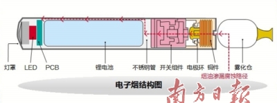 电子烟是一种传统卷烟的替代品之一,由锂电池、烟弹(含液体挥发物)、压力传感器、控制电路板、发光二极管等组成,工作原理是通电加热烟弹内液体,形成烟雾供使用者吸入。而“烟雾”所含的成分主要为尼古丁、各类香料(调配成各类口味)、挥发物(烟雾),当尼古丁到达大脑神经中枢位置时,就会使吸烟者产生满足感从而降低对传统卷烟的兴趣,逐渐达到戒烟目的。