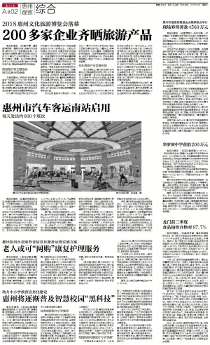 南方日报讯 (记者/卢慧 通讯员/李旦梅 缴娜)日前,由惠州市旅游局、惠州市文化广电新闻出版局、广东省旅游协会指导,惠州市旅游协会主办的2018惠州文化旅游博览会(以下简称“旅博会”)落幕。此次旅博会期间,共有200多家企业参展,推出众多优惠旅游产品,展销特色鲜明的旅游商品。