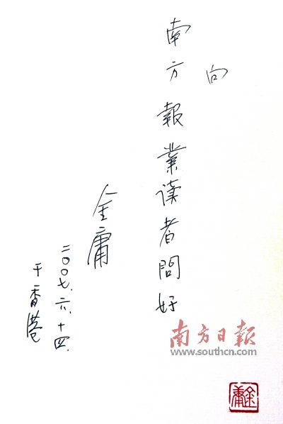 作为老一辈“报人”,金庸对媒体有很深的感情,还曾两次接受《南方日报》记者的专访。2007年,金庸还曾亲笔题字:“向南方报业读者问好”。