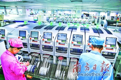 全球产业巨头纷纷落户东莞。图为东莞一高新技术企业的自动化生产车间,技术工人操作贴片机生产。南方日报记者 孙俊杰 摄 |