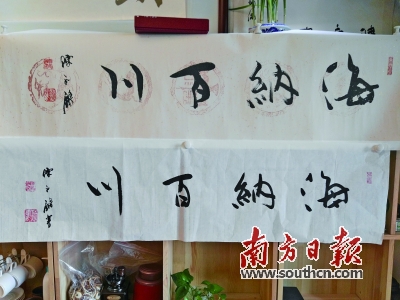 不过,就算模仿得再像,假的还是真不了。在何文发的协助下,记者和郭剑林很快联系到了陈永锵的儿子兼艺术经纪人陈志彦。为验明真假,陈显伦特意从中挑出两件他认为模仿得最像的作品,一幅是“惠风和畅”,另一幅“海纳百川”,并把它们与两幅内容相同的真迹挂在一起让陈志彦分辨。