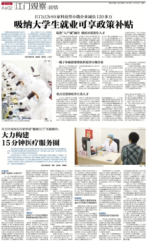 在年初召开的江门“两会”上,《江门市政府工作报告》提出了建设“健康江门”的概念。如何更好地提升现有医疗卫生服务水平,解决“看病难、看病贵”问题,是打造“健康江门”的应有之义。记者日前采访发现,江门正努力通过深化医药卫生体制改革,开展“医联体”管理,探索“互联网+分级诊疗”模式,推进城市医疗卫生高地建设等工作,着力补齐基层医疗卫生“短板”,力争提升民众健康水平。