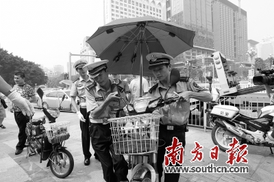 | 深圳街头,在一名交警带领下,辅警正在对电动单车进行收缴处罚。 南方日报记者 鲁力 摄 |