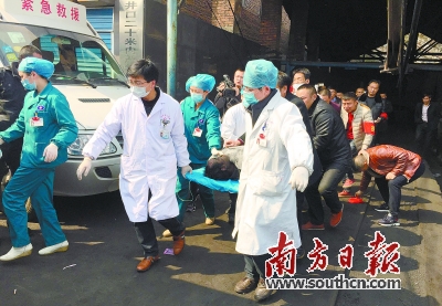 记者从湖南涟源矿难现场获悉,14日发生的涟源斗笠山镇祖保煤矿爆炸事故,当班下井29人,自行安全升井16人,救出4人,死亡9人。图为救援人员将获救矿工抬上救护车。