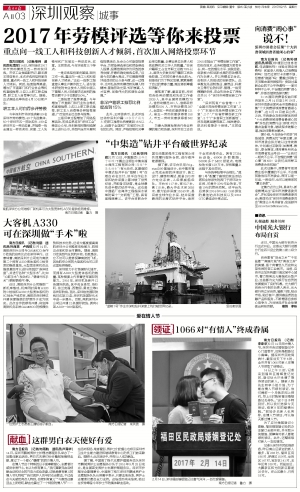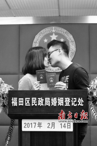 南方日报讯 (记者/李荣华)2月14日西方情人节,深圳市各区婚姻登记中心门庭若市,迎来婚姻登记小高峰。据深圳市民政局统计,截至当天下午6时,全市共有1066对新人在情人节领取了结婚证。