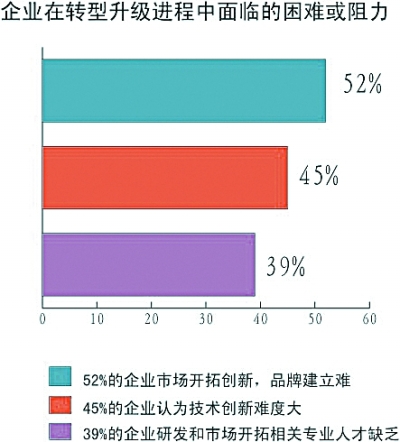 对于企业在转型升级进程中面临的困难或阻力(多选项目),52%的企业认为“市场开拓创新、品牌建立难度高”,45%的企业认为“技术创新难度大”,39%的企业认为“研发和市场开拓相关专业人才缺乏”,均将矛头指向了“创新力不足”。